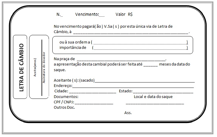 A exemplo do cheque, a letra de câmbio é uma ordem de pagamento, não uma promessa de pagamento, como a nota promissória. Mesmo sendo pouco usada, está recepcionada a protesto conforme Lei federal 9492/97.