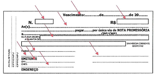 As setas vermelhas indicam onde se deve ter excesso de zelo no preenchimento dos dados nos títulos. Cuidando sempre para não informar dados incorretos, não rasurar ou borrar, tornando-os ilegíveis. Pois, todas as informações nestes apresentadas serão interinamente responsabilidade do credor apresentante e este responderá tanto na esfera civil quanto criminal, por quaisquer danos que possa vir a sofrer o devedor.